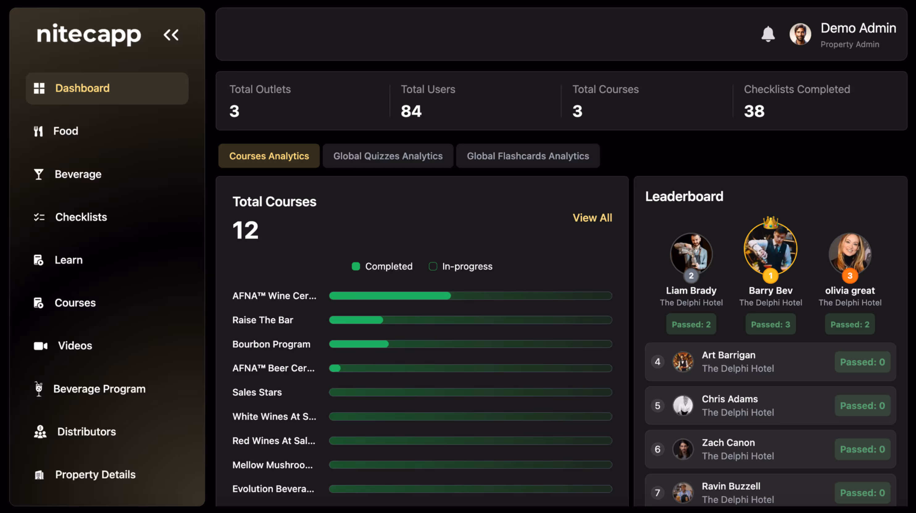 nitecapp gives hospitality leaders the power to train teams, manage programs, and measure performance in real time — driving consistency, compliance, and profitability across every property.